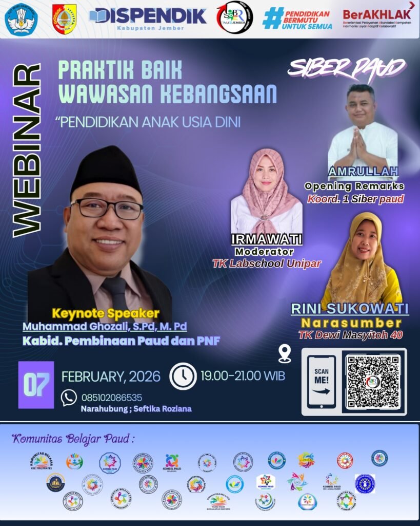 Dalam rangka berbagi dan pengimbasan Praktik Baik Wawasan Kebangsaan pada Pendidikan Anak Usia Dini, kami mengimbau kepada seluruh guru PAUD di Kabupaten Jember untuk berpartisipasi aktif dalam kegiatan webinar Kolaborasi Komunitas Belajar terintegrasi dengan Siber PAUD.